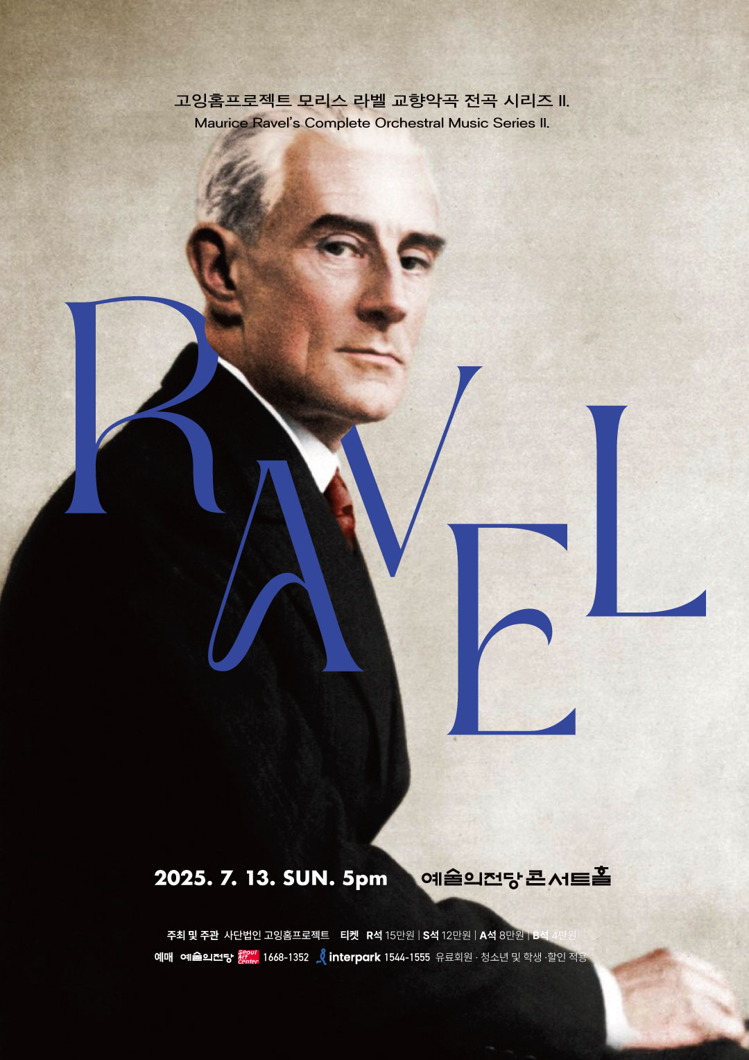 | 고잉홈프로젝트: 라벨 교향악곡 전곡 시리즈 2. 2025. 7. 13. (Sun) 5pm 예술의전당 콘서트홀 | 모리스 라벨 Maurice Ravel 대양 위의 조각배 Une barque sur l'océan 어릿광대의 아침 노래 Alborada del gracioso 피아노 협주곡 G장조 Concerto en sol 세르게이 바바얀, piano INTERMISSION꽃말 Le langage des fleurs 스페인 광시곡 Rapsodie Espagnole 라 발스 La valse 플레이디렉트(연주 및 지휘): 스베틀린 루세브 |